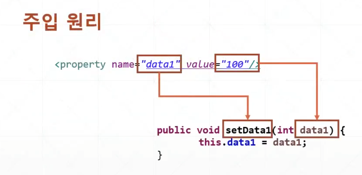 Bean을 정의할 때 Bean 객체가 가지고 있을 기본 값을 생성자가 아닌 Setter 메서드를 통해 주입할 수 있다.