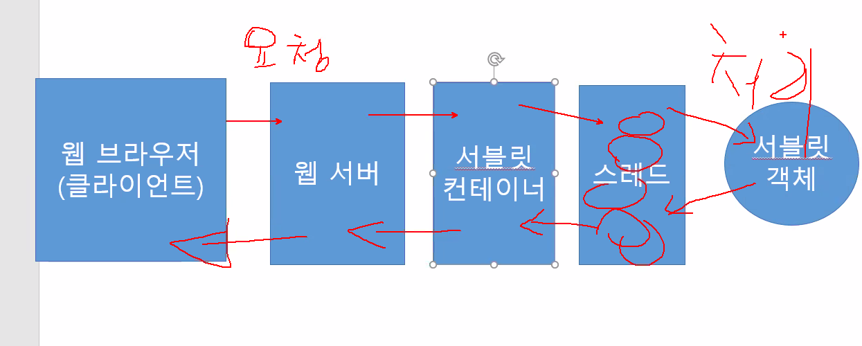 브라우저에서 요청 -> WAS에 웹서버가 서블릿 요청을 인식-> 서블릿컨테이너에게 수행하도록 넘김