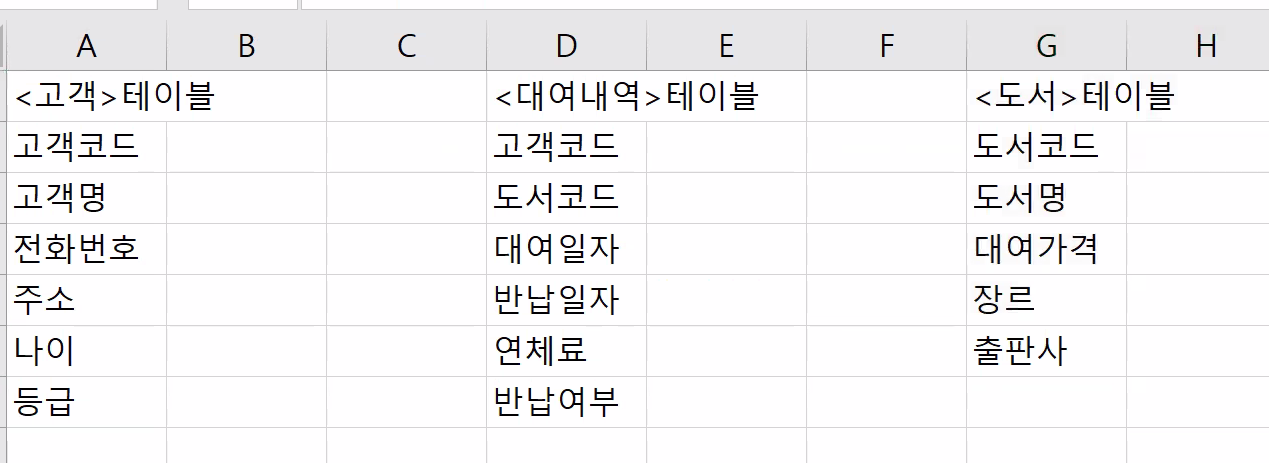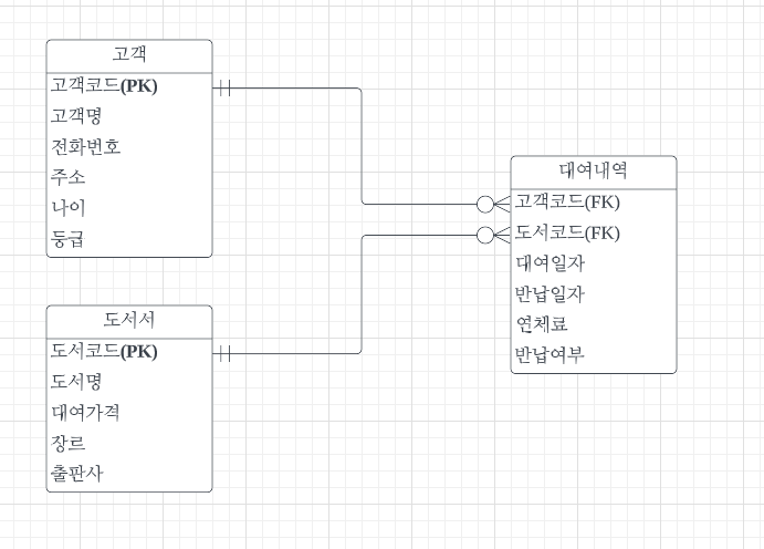 고객, 대여내역, 도서 테이블에 대한 lucidchart 이용 ↓