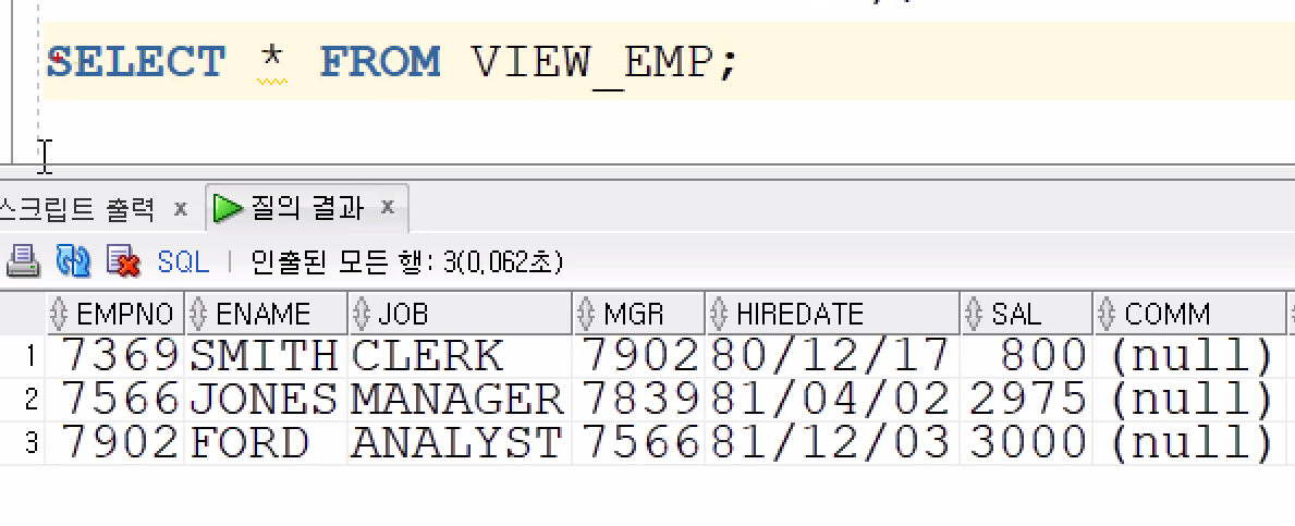 - 논리적인 가상테이블: 실제데이터는 존재하지않고 테이블에 대한 sql 문만 존재