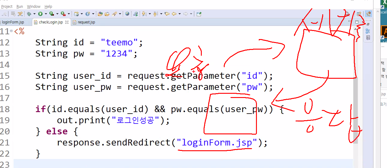 로그인 창 -> 요청 -> 아이디와 비밀번호 체크
