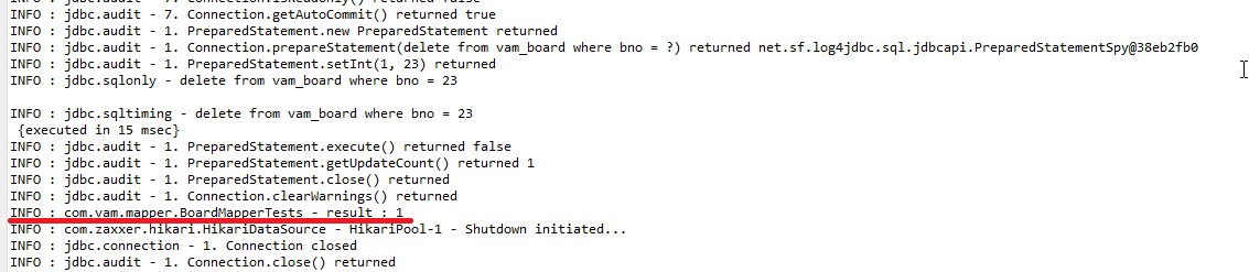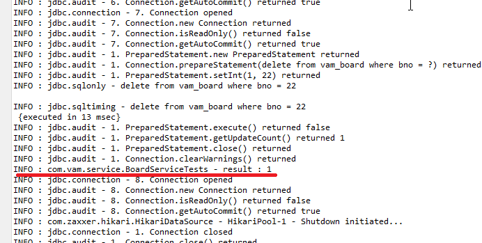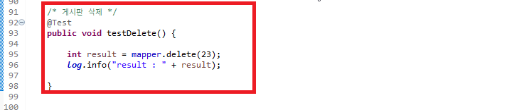 BoardMapperTests.java 에서 작성한 삭제 메소드를 Junit 테스트합니다.