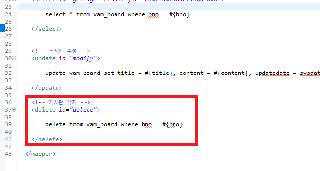 <delete>태그를 추가 후 앞서 테스트한 DELETE쿼리문을 활용하여 쿼리문을 작성합니다.