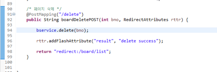 public String boardDeletePOST(int bno, RedirectAttributes rttr) {