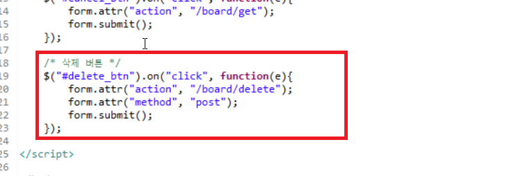 '삭제' 버튼 동작을 위해 아래의 Javascript 코드를 추가합니다.