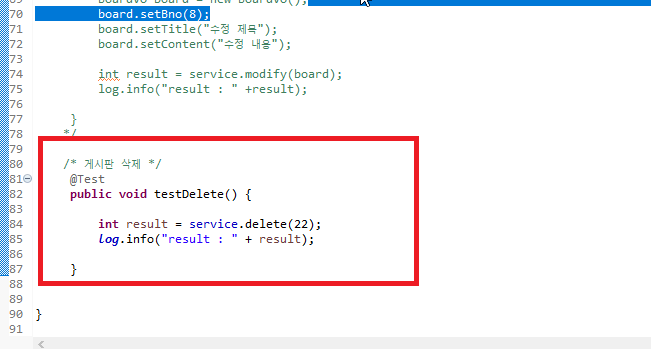 작성한 Service 메소드를 테스트합니다. BoardServiceTests.java 클래스에 기존의 테스트 코드를 주석 처리한 후 아래의 코드를 추가하여 junit 테스트합니다.