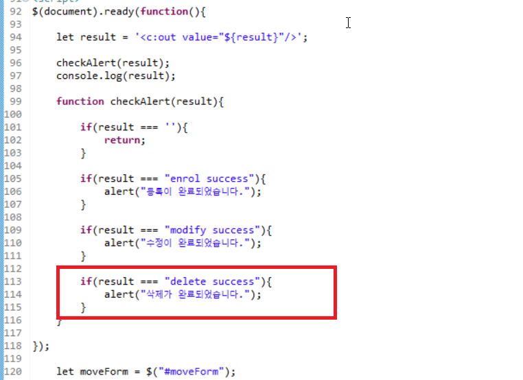 - 리스트 페이지(list.jsp) 페이지 이동 시 수정이 완료되었음을 알리는 경고창을 띄우기 위해 "delete success" 스트링 데이터를 "result" 속성 값에 저장하는 addFlashAttribute() 메소드를 호출하였습니다.