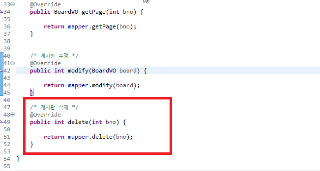 BoardServiceimpl.java 클래스에 인터페이스에서 선언한 메소드를 구현합니다. 구현부에는 BoardMapper.java 인터페이스의 '게시판 삭제' 메소드를 호출합니다. int를 반환해야하기 때문에 return 값에서 Mapper 메소드를 호출합니다.