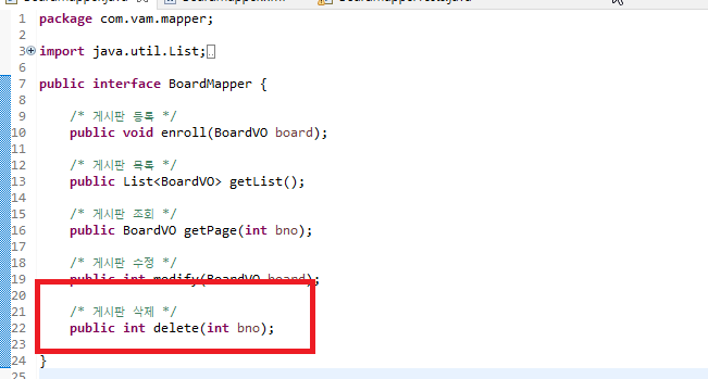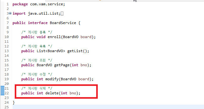 BoardService.java 인터페이스에 '게시판 삭제' 메서드(delete())를 추가합니다. 앞서 Mapper 메소드와 같이 '게시판 번호(bno)'에 대한 정보만 있으면 되기 때문에 int형 변수를 파라미터로 부여합니다.