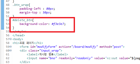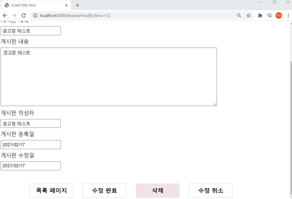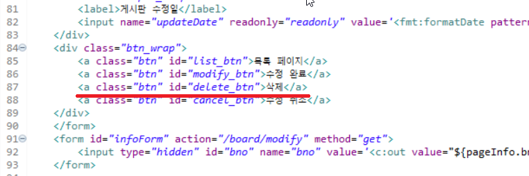'수정 페이지(modify.jsp)'에서 '삭제'버튼을 추가하는 작업과 '목록 페이지(list.jsp)'에서 삭제 성공 경고창을 띄우기 위한 Javascript 작업을 해야 합니다.