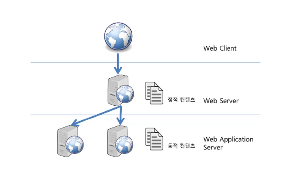 WEB 서버는 HTML 문서같은 정적 컨텐츠를 처리하는 것이고 (HTTP 프로토콜을 통해 읽힐 수 있는 문서) WAS 서버는 asp, php, jsp 등 개발 언어를 읽고 처리하여 동적 컨텐츠, 웹 응용 프로그램 서비스를 처리하는 것이다. 처리하는 기능은 나누어져있지만 요새 WAS 서버에는 WEB서버 기능을 내장하고 있다. 현재는 WAS가 가지고 있는 웹 서버도 정적인 콘텐츠를 처리하는 데 있어서 성능상 큰 차이가 없다. 큰 규모라면 웹 서버와 WAS를 분리합니다. 그 이유는 자원 이용의 효율성 및 장애 극복, 배포 및 유지보수의 편의성을 위해서이다. JSP를 배울 때 대체적으로 Apache와 Tomcat을 사용한다.