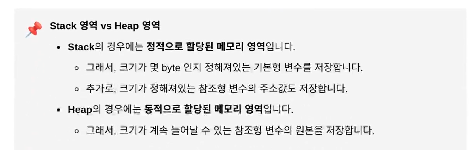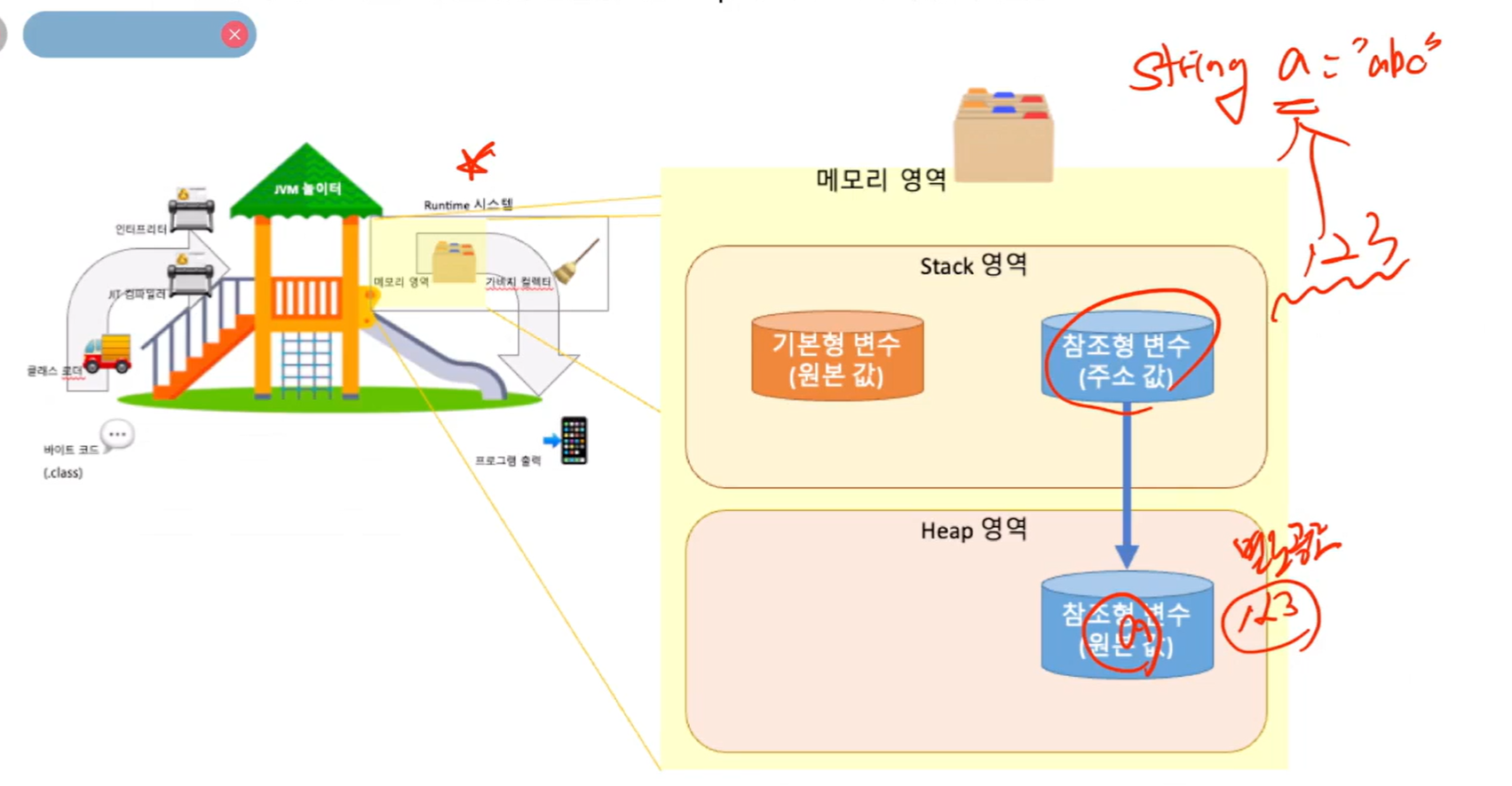 기본형 변수와 참조형변수의 주소값을 저장하는 부분은 Stack영역이고