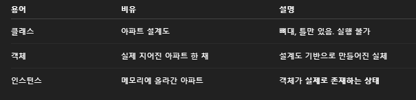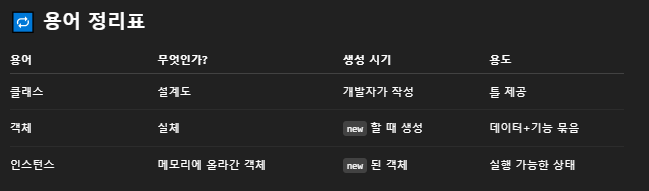 | 관계 | 객체를 만들기 위한 틀 | 클래스 기반으로 만들어짐 | 객체 = 인스턴스 (거의 동의어) |
