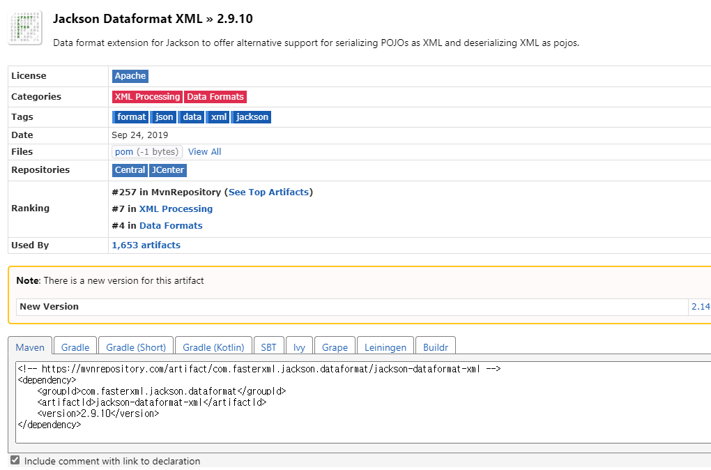 jackson dataformat xml 검색후 2.9.10 버전 찾아서 복사 붙여넣기