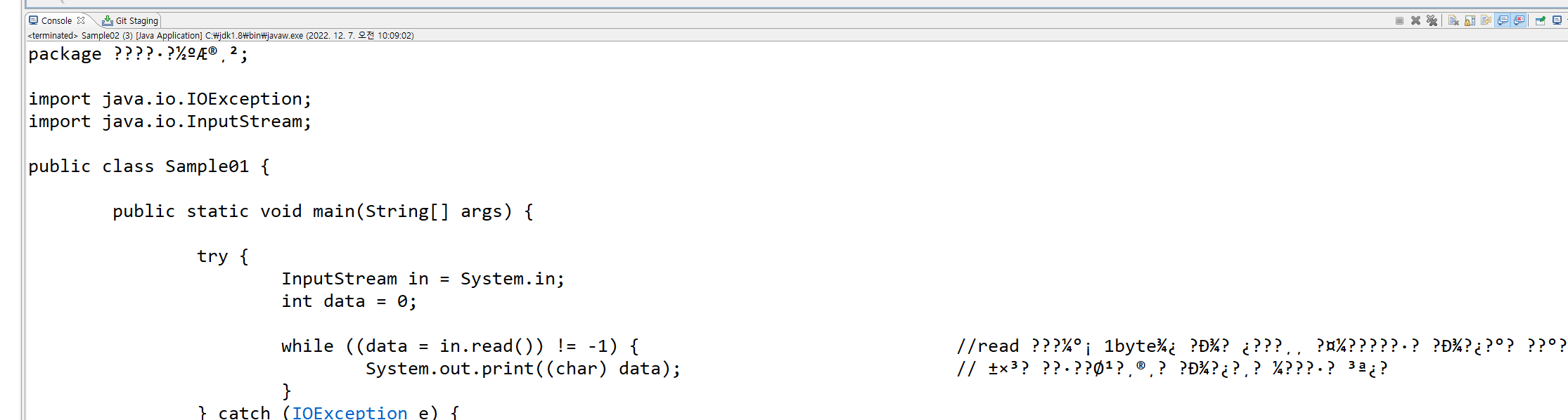while ((data = in.read()) != -1) { //read 자체가 1byte씩 읽어 오지만 정수형태로 읽어오게 되고