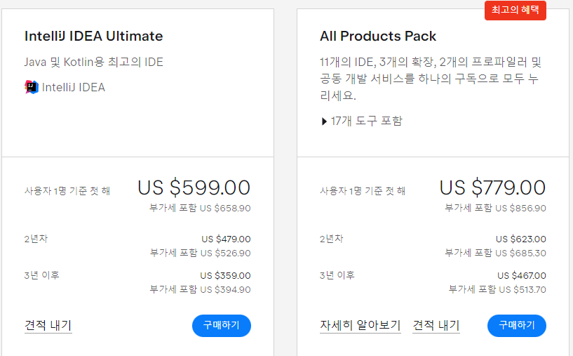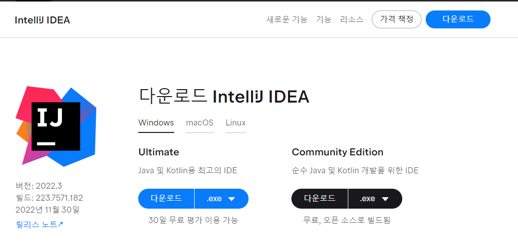 인텔리제이는 이클립스와는 다르게 유료버전 무료버전으로 나뉘다보니 금전적인 여유가 있다면 얼티메이트 버전으로 다운받으시면 됩니다.