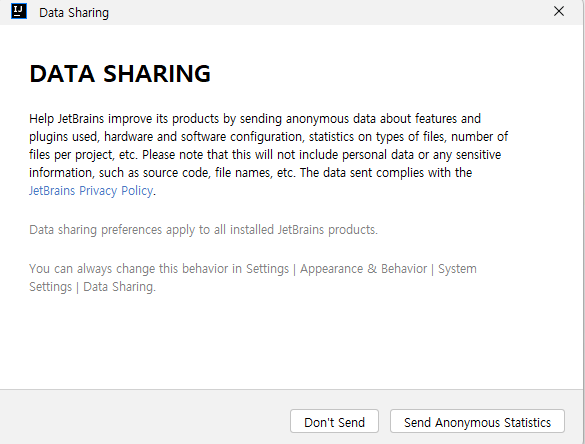 데이터 공유 관련해서 여쭤보는 것 같은데 "Don't Send"를 눌러줍니다.
