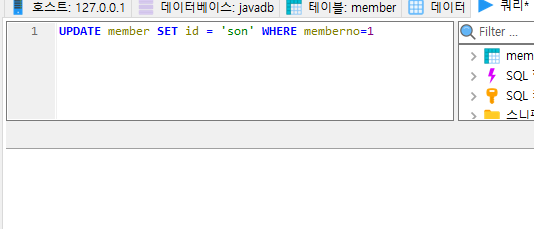 member 테이블에서 memberno가 1인 id를 son 이라는 데이터로 변경