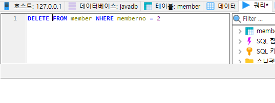 member테이블에서 memberno가 2인것을 삭제하라