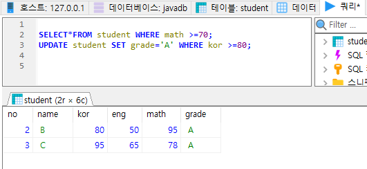 kor이 80이상인것만 grade를 A로 변경