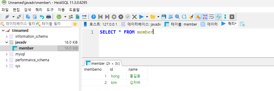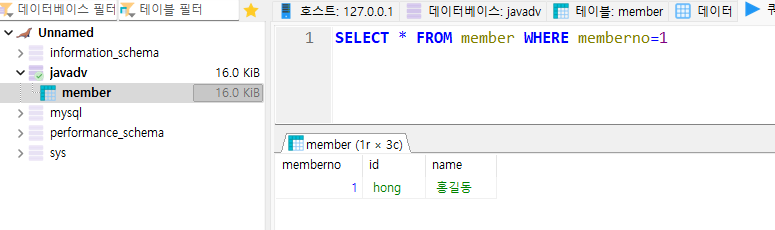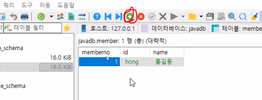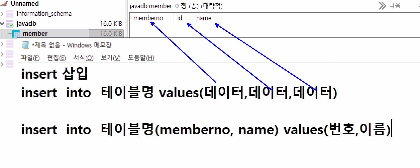 - insert into 테이블명(memberno, name) values(번호, 이름)