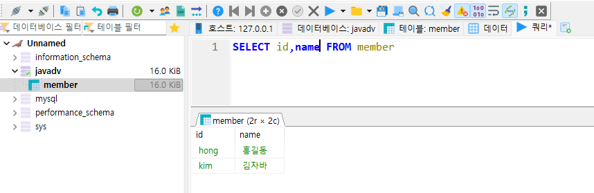 - 특정 필드만 보고 싶을때는 '*' 대신 해당 필드명을 넣으면 된다.