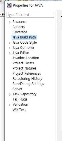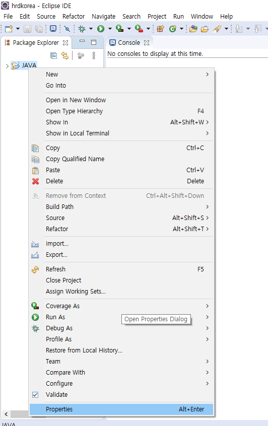 자바프로젝트 폴더를 클릭한뒤 우클릭하여 Properties 클릭 ↓