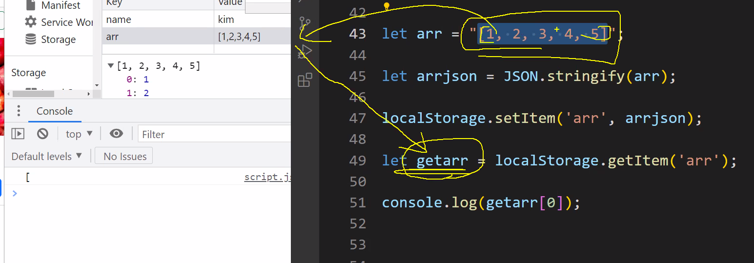 localStorage.setItem('name',JSON.stringify([name])) /**name은 문자라 [name]으로 배열형태로 */