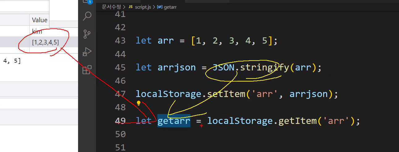 getarr =JSON.parse(getarr); /**원래 오브젝트 형태로 다시 돌려줌,json에서 배열로 변환 */