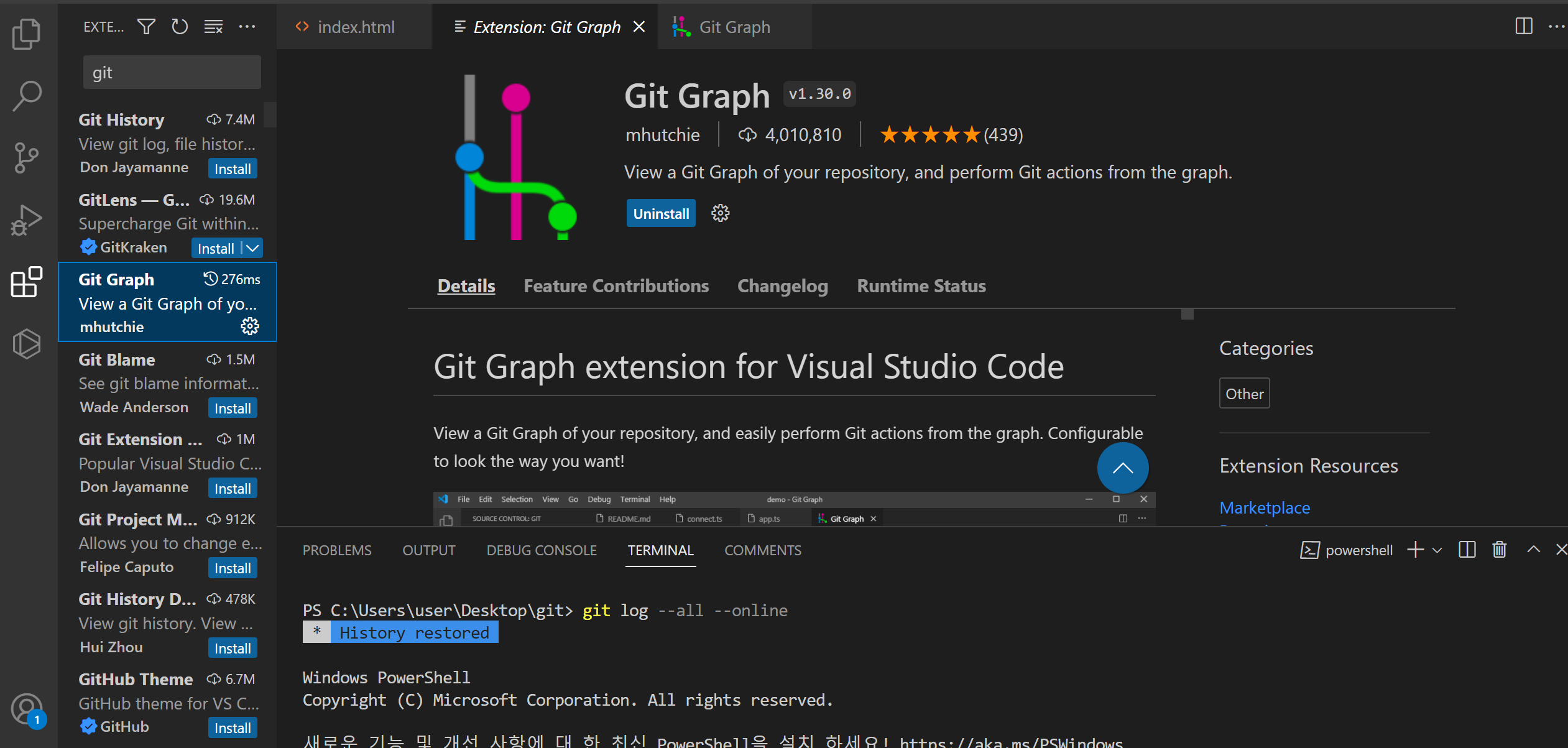 비쥬얼스튜디오 확장프로그램에서 깃그래프 다운로드
