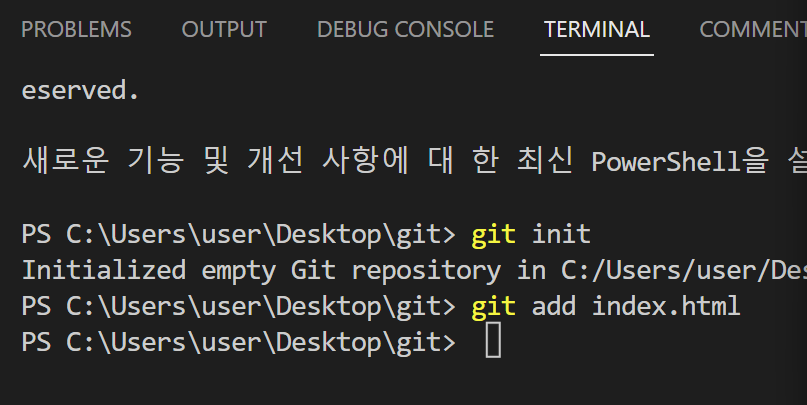 PS C:\Users\user\Desktop\git> git add index.html
