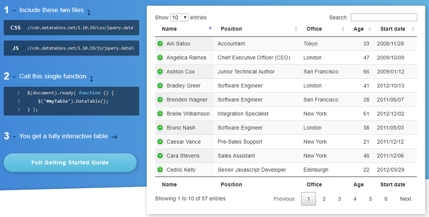 DataTables그리드 데이터테이블 그리드 라이브러리 Grid 라이브러리-Datatables 사용법/예제 https://saintsilver.github.io/datatables-ex/ DataTables Examples saintsilver.github.io DEMO : https://saintsilver.github.io/datatables-ex/ 기본 사용 공식홈페이지에 들어가시면 메인페이지에 등장합니다. 윗 스크린샷에서 설명이 생략된 #myTable 은 아래와 같은 구조로 만드시면 되고, 서버사이드로 데이터를 처리하여 데이터테이블을 만들 시 를 선언하시고 실제로 값을 넣으시면 됩니다. 저는 ajax로 처리할 예정이라서 만 사용했습니다. 공식홈페이지에선 데이터가 100,000건 이상이면 서버사이드로 처리하라고 권장하고 있습니다. 컬럼1 컬럼2 컬럼3 .. 웹/자바스크립트 2023.08.11