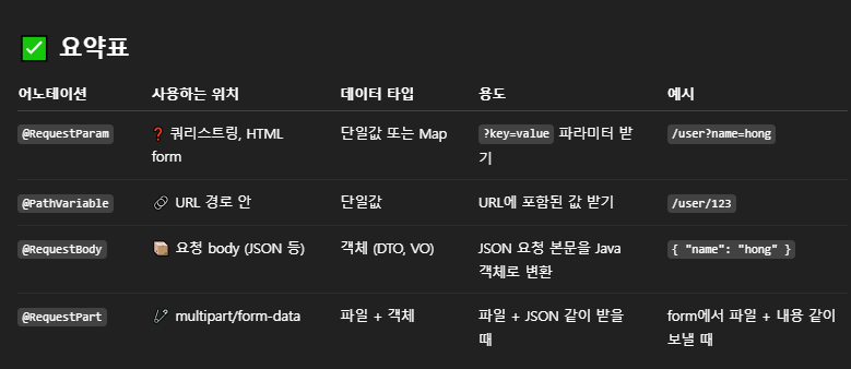 상세 예제 비교1. @RequestParam@GetMapping("/search")public String search(@RequestParam String keyword) { return "검색어: " + keyword;} 요청 예시:GET /search?keyword=건축 2. @PathVariable@GetMapping("/user/{id}")public String getUser(@PathVariable Long id) { return "ID: " + id;} 요청 예시:GET /user/123 3. @RequestBody@PostMapping("/user")public String createUser(@RequestBody UserVO user) { return "이름: " + ..